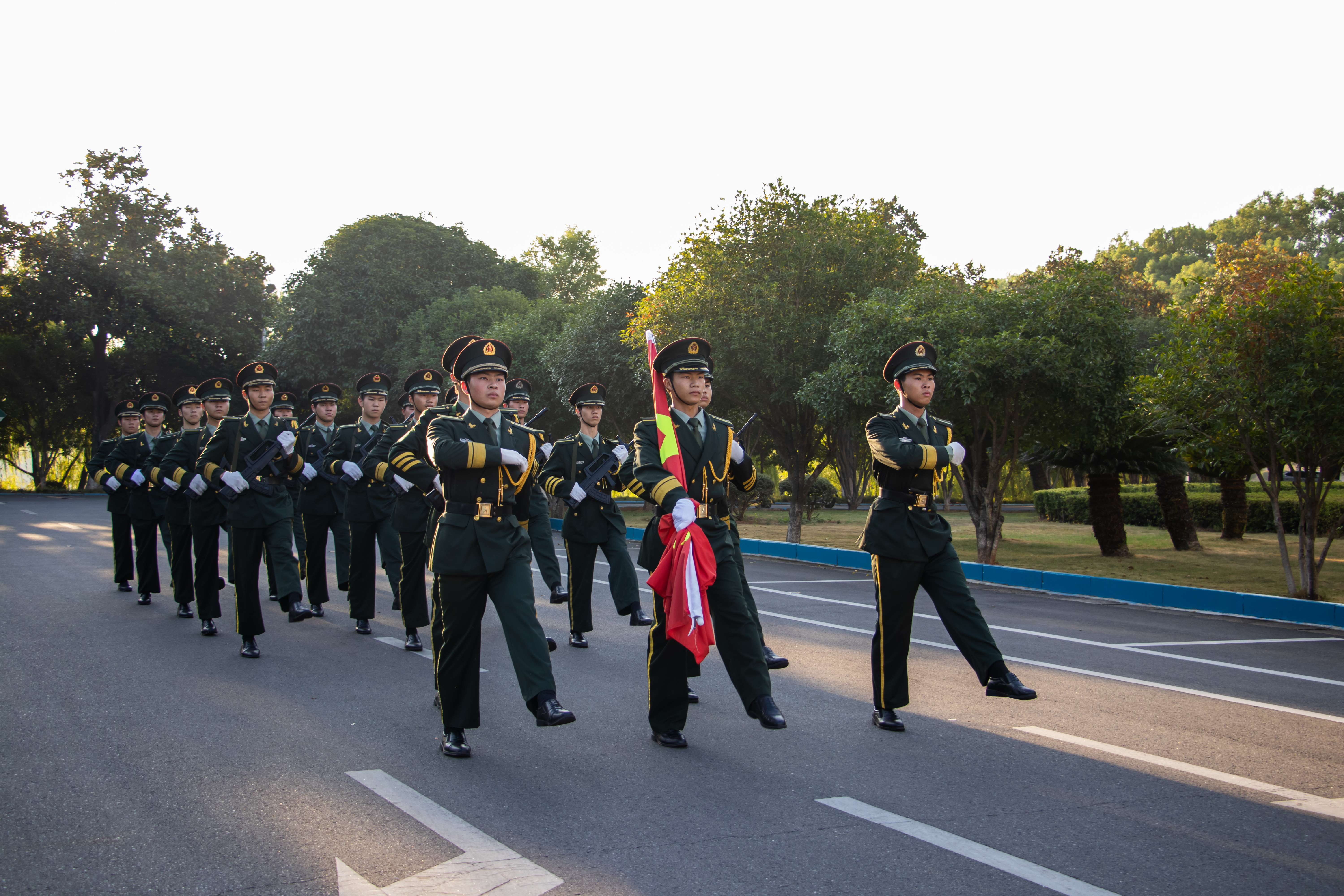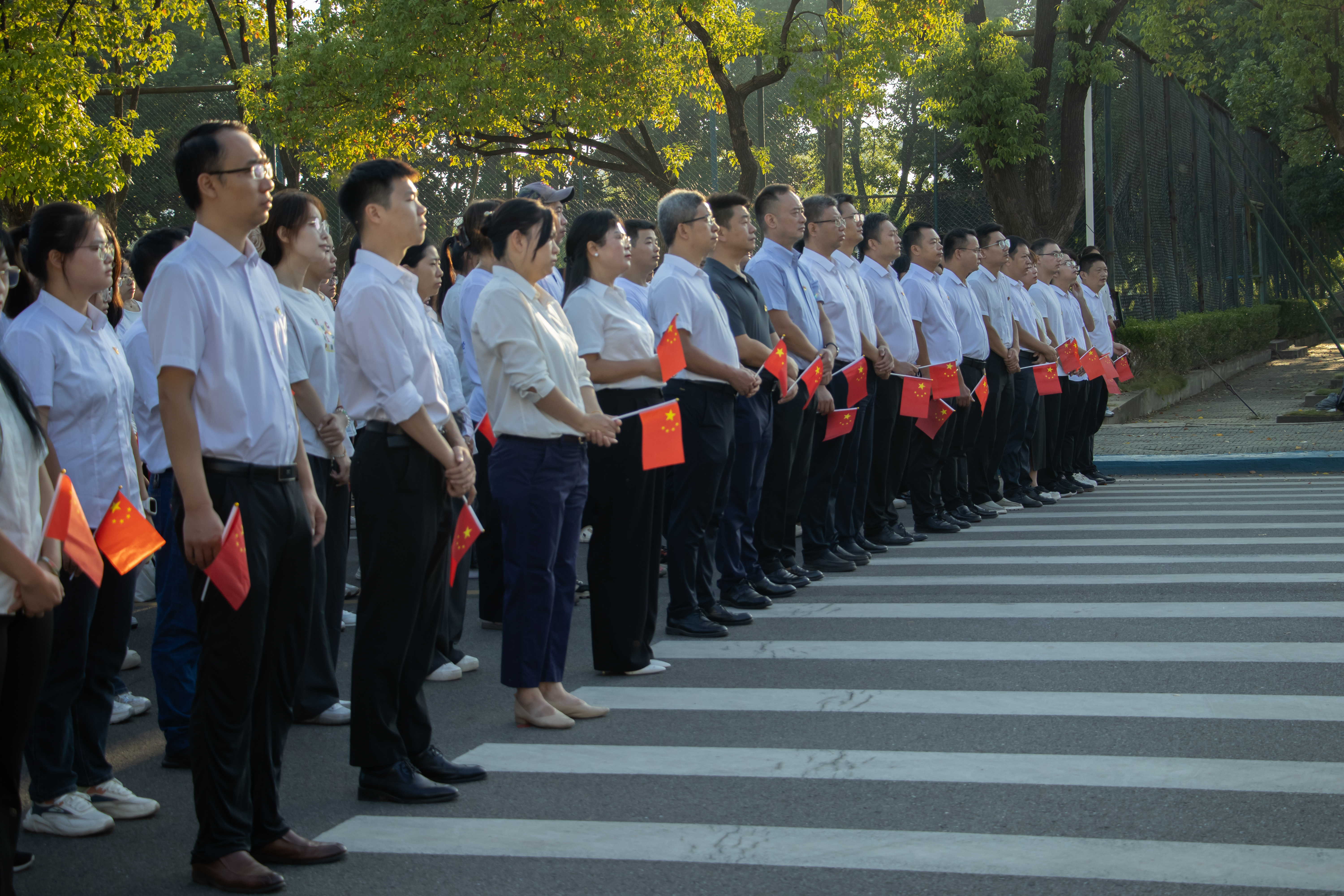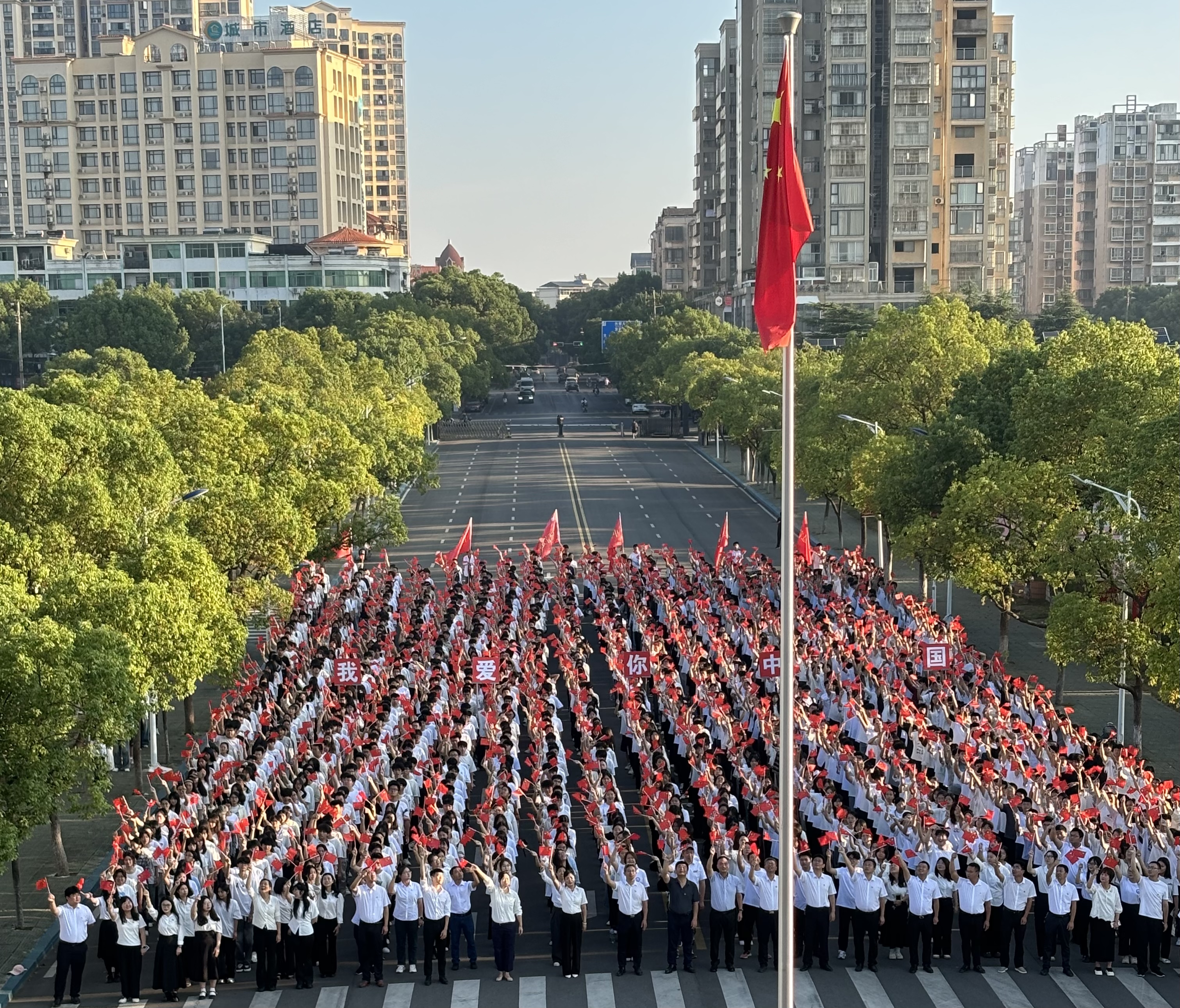 清晨7时整,升旗仪式正式开始。1600余名师生在办公楼前整装列队,国旗护卫队迈着铿锵有序的步伐庄严入场,护送五星红旗正步迈向旗杆,伴随着雄壮的国歌声,升旗手奋力挥臂将国旗抛向空中,鲜艳的五星红旗冉冉升起,全体师生肃穆而立,满怀崇敬之情,庄严地向国旗行注目礼,向国旗、向伟大祖国致以崇高的敬意。