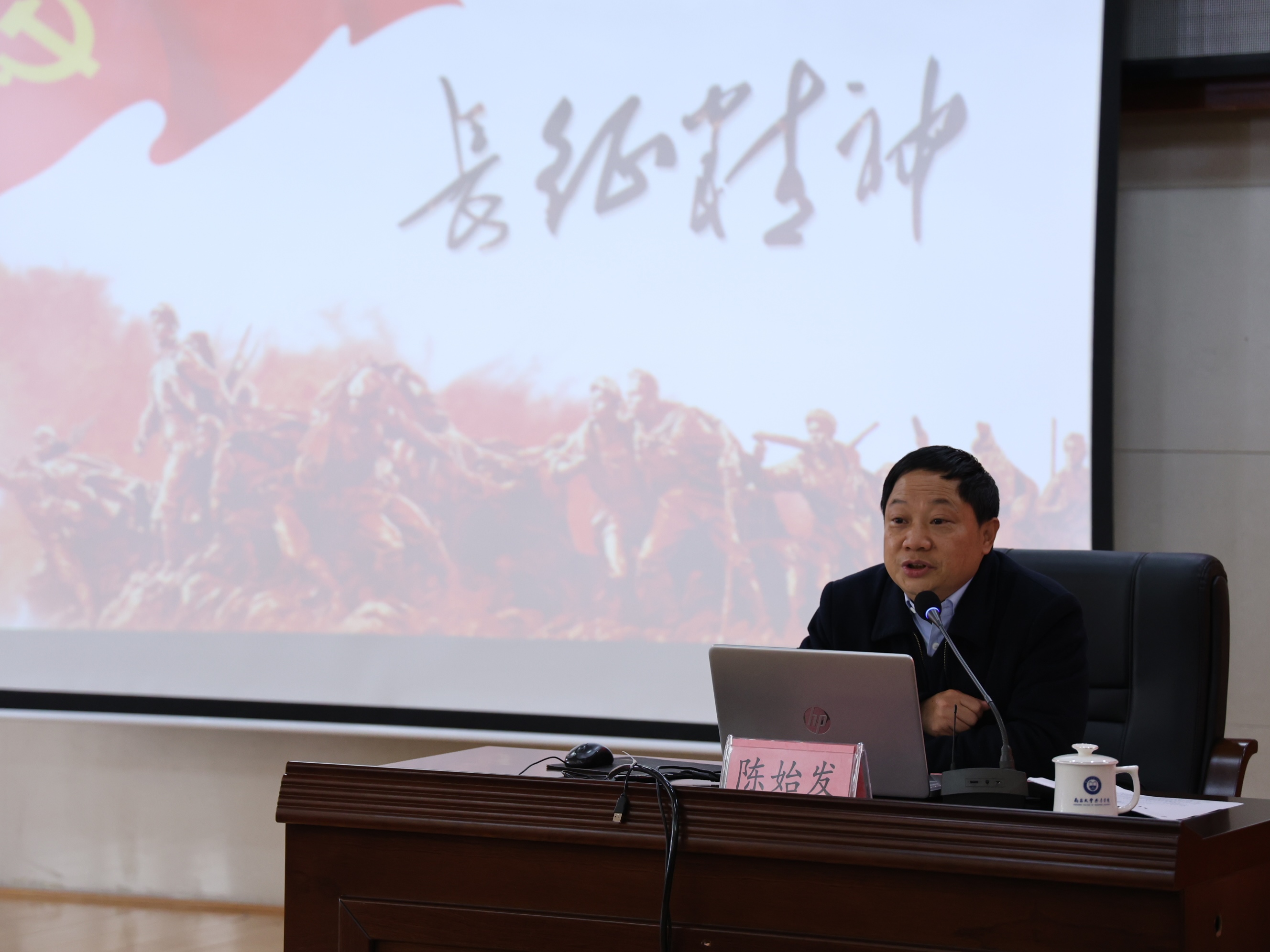陈始发教授以《长征精神》为主题,分伟大长征孕育伟大长征精神、伟大长征精神的深刻内涵及弘扬伟大长征精神的时代要求三部分展开,从理想信念、奉献牺牲、攻坚克难、群众路线四个维度,佐以丰富的事例,深入浅出带领师生一起回望那段艰苦卓绝的岁月,重温那段波澜壮阔的历史,共同感受伟大的长征精神。“今年是红军长征出发90周年,漫漫征途中,红军同敌人进行了600余次战役战斗,跨越近百条江河,攀越40余座高峰,穿越茫茫草地,用顽强意志征服了人类生存极限。”红军长征创造了中外历史的奇迹,是中国共产党和红军谱写的壮丽史诗,是中华民族伟大复兴历史进程中的巍峨丰碑。