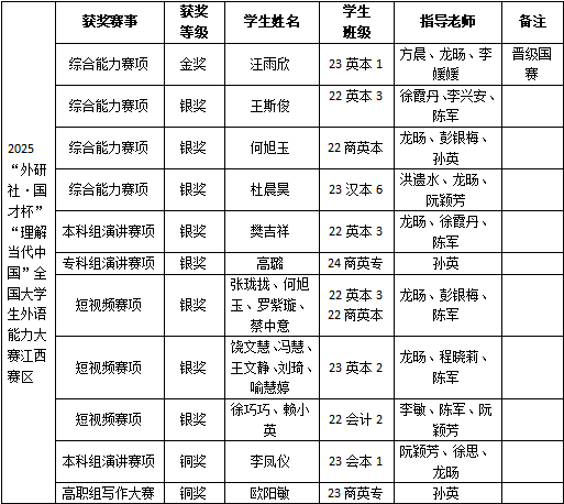 此次大赛的优异成绩既是对我校学子英语综合水平的肯定,也是对教学成果的一次重要检验,更充分展示了我院人文学院在外语教育和综合素质培养方面的卓越成果。今后,学院将继续秉持“以赛促学、以赛促教”的教育理念,不断提升学生的外语能力和综合素质,为培养更多具有国际竞争力的人才贡献力量。